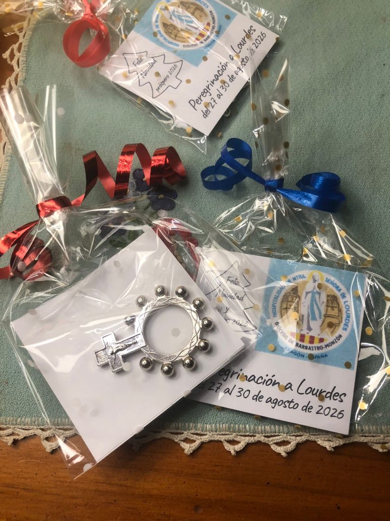 A lo largo de estos días se está entregando un regalo desde la Hospitalidad diocesana de Ntra. Sra. de Lourdes a los enfermos y ancianos con motivo de la proximidad de la Navidad. Se trata de una bolsita con una cinta de color conteniendo un rosario de dedo y una pequeña tarjeta navideña recordando también la fecha de la próxima peregrinación 2026 a Lourdes. En algunas poblaciones se está repartiendo (Monzón, Fraga…) y en otras será en los próximos días (Graus, Binéfar, Binaced, Tamarite de Litera, Zaidín, Candasnos, Pueyo de Santa Cruz, Barbastro, etc.).