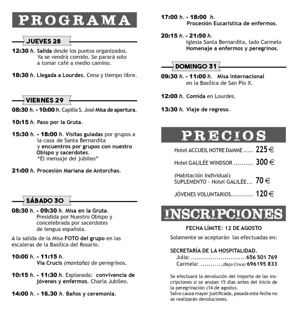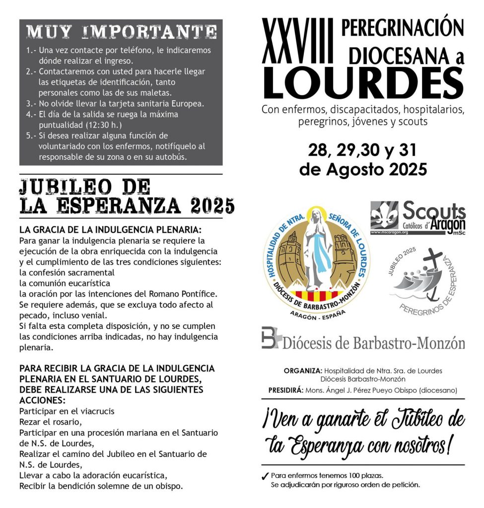 Iniciamos las inscripciones para acudir al santuario de Ntra. Sra. de Lourdes dentro de la peregrinación anual que prepara la Hospitalidad diocesana. Se trata de la XXVIII peregrinación entre los días 28 al 31 de agosto y de toda la diócesis de Barbastro-Monzón.